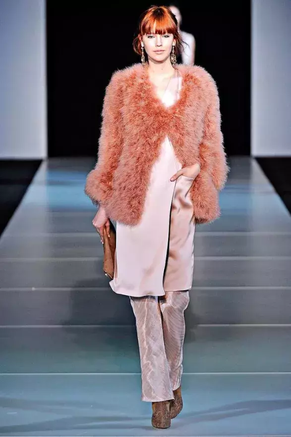 Zimní kolekce Giorgio Armani je o mnoho romantičtější než linie Emporio. Zatímco v první předvedl návrhář přehlídku černé s pouhým náznakem jasných barev, tentokrát dokázal, že ani jiná než tmavá paleta barev mu není cizí. Ale zas tak moc to nepřeháněl. Černou promíchal s kovově šedou, prim hrály pudrové tóny. Ve všech variacích – nude, starorůžová, písková. Linie byla něžná, na což u italského návrháře nejsme zvyklí…