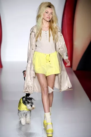Emma kolekci barevně vyvážila. První polovině vládly odstíny žluté, tělové a zelené, druhé polovině pak elegantní černá. Nejvtipnější model? Vinylová pláštěnka, kterou předvedl roztomilý teriér. :-)