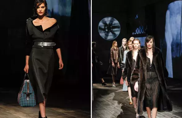 Po týdnech módy v New Yorku a Londýně i Milán přichází s tématem silné ženskosti zahalené temnotou doby. Jedná se jak o reakci na současnou politickou situaci a probíhající krizi, tak i o inspiraci Hitchcockovými snímky, v nichž ženy vždy hrály prim. Po jasné inspiraci Japonskem, kterou naplánovala na jaro a léto, se v druhé polovině roku vydala Prada hledat jinam – do vlastních archivů. V každém modelu byl cítit silný odkaz na minulé kolekce této slavné značky. Linie, kterou na dřevěnou runway ponořenou do hry světla a stínu Miuccia Prada vyslala, obsahovala všechny základní stavební kameny domu Prada. Oversized kabely, široké pásky i ultravysoké platformy.