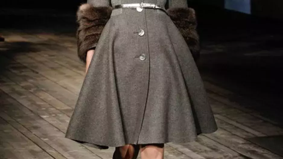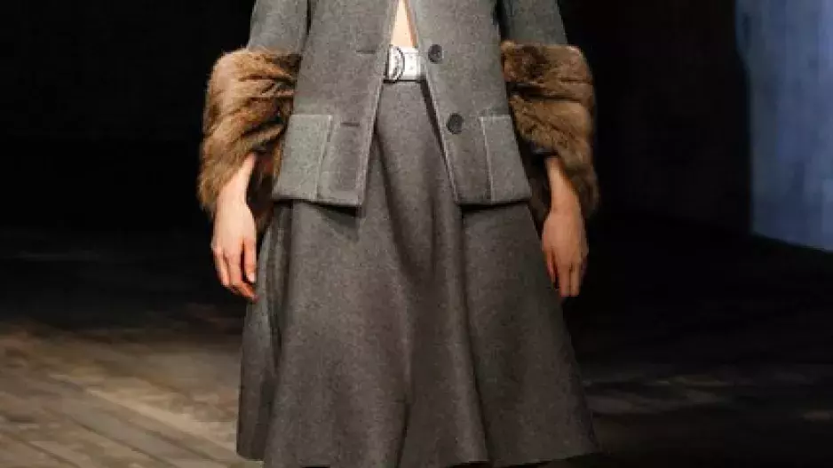 Na molu, kdy přehlídku doplnila projekce s motivy ptáků, koček a dámské siluety, se skloňovalo téma pruhy. Tak jako ostatní kreativní ředitelé i Miuccia zvolila barevně kontrastní široké čáry. Na sukních a kabátech se objevil i drobný vzor čtverců. Dominantním prvkem byly rozhodně kožešinové maxilemy na rukávech. Dalším typickým znakem se staly šaty ležérně spadlé z jednoho ramena. Setmělý sál sem tam rozsvítily třypky a metalické odlesky kovu i látky. Celou show ukončila hra protikladů – jemné transparentní hedvábí versus těžký kožich.