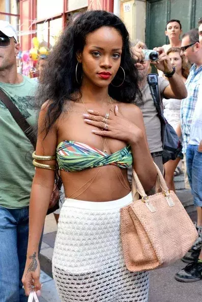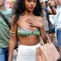 Ukažte své řetízky a šperky i ve městě. Stačí vám k tomu sukně do pasu a jednoduchý vršek od plavek, look alá Rihanna.
