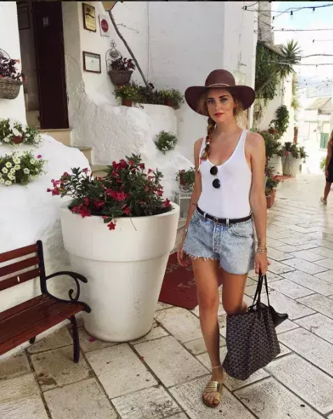 Bílé plavky vyzdvihnou vaše opálení, tak proč je mimo bazén odkládat? Zkombinujte je jako Chiara Ferragni s kloboukem, džínovými kraťasy a chic sandálky a máte perfektní look na procházku do města.