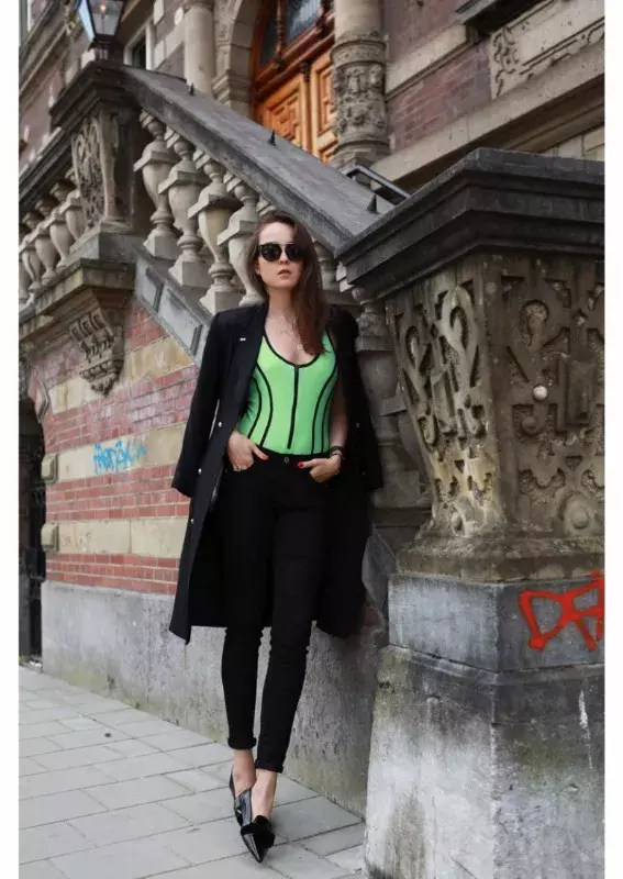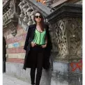 Neonka na pláži, neonka i ve městě? Podle blogerky Andy Torres klidně! S černými džínami a kabátem přehozeným přes ramena.