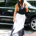 V jednoduchosti je síla. Perfektní příklad letní elegance podle Kim - jednoduché plavky jako top, plisovaná dlouhá sukně, páskové sandálky na podpatku. Z pláže můžete rovnou na koktejl.