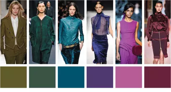 Návrháři si pro podzim a zimu rozdělili spektrum na tři oddíly. Neutrální, teplé a studené. V první kategorii se vyjímala například šedá, khaki, nude i slonová kost. Teplou škálu zastoupily odstíny vínové, karamelové, červeného pomeranče, žluté či hořčicové. Zástupci studené pak jsou kobaltová, lahvově zelená, fuchsiová, petrolejová, inkoustová, ale i něžná pudrově modrá.