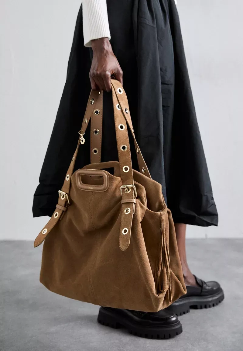 Světle hnědá semišová maxi kabelka, Maje, Zalando, 13 780 Kč