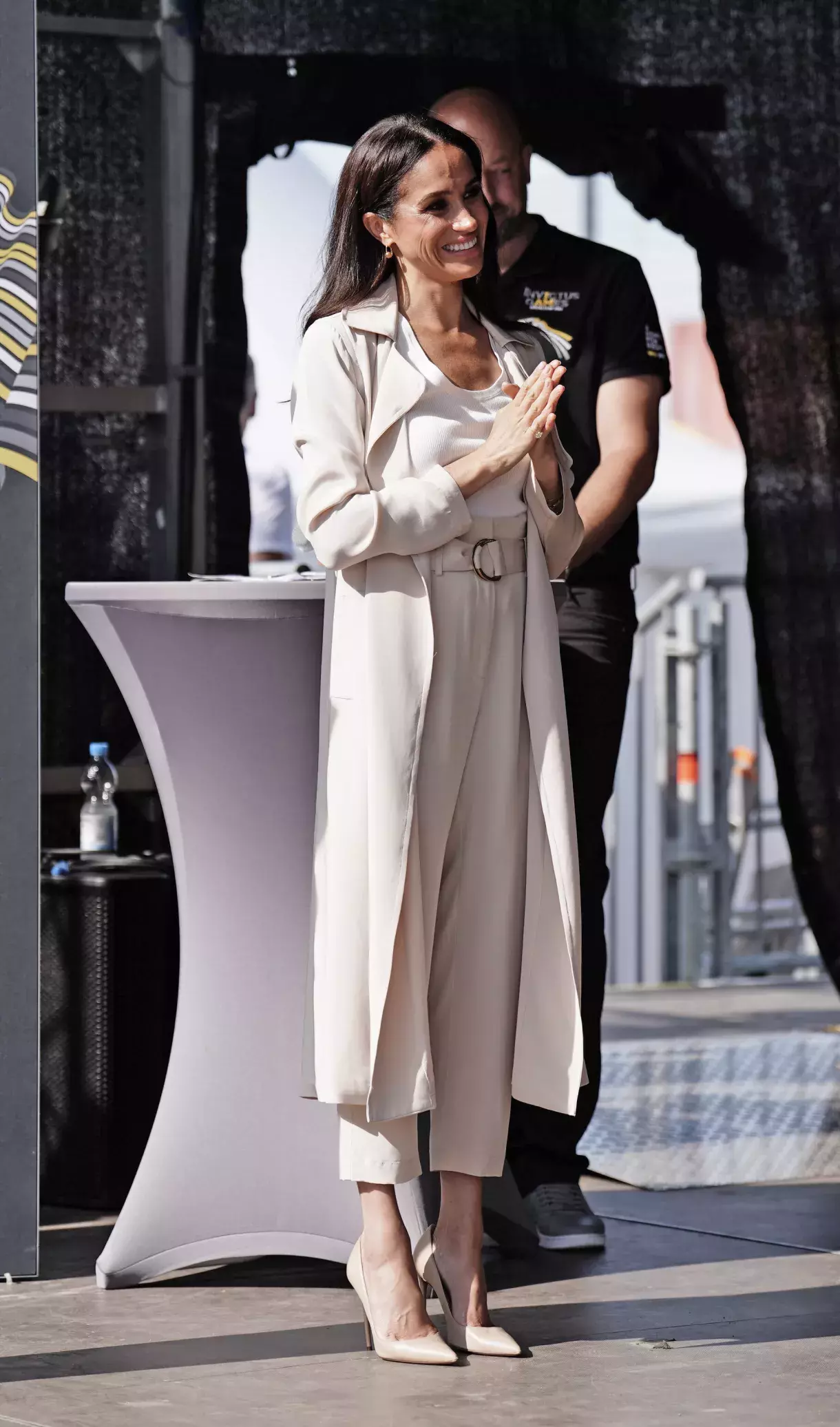 Vévodkyně Meghan v krémovém trenčkotu a v kalhotách s vysokým pasem