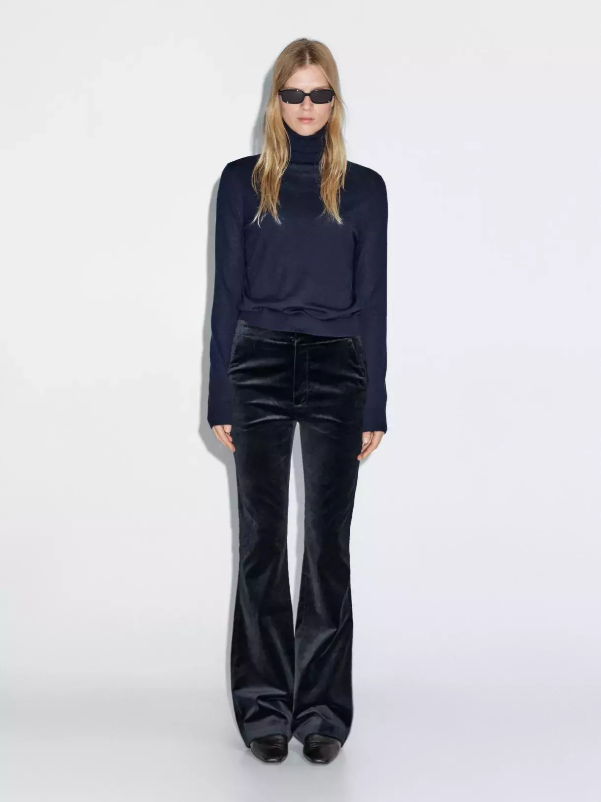 Tmavě modré sametové kalhoty s flare nohavicemi, Massimo Dutti, 1 999 Kč