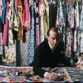 Portrét italského módního návrháře sedícího vedle vlastních vzorů látek pořízený v sedmdesátých letech.