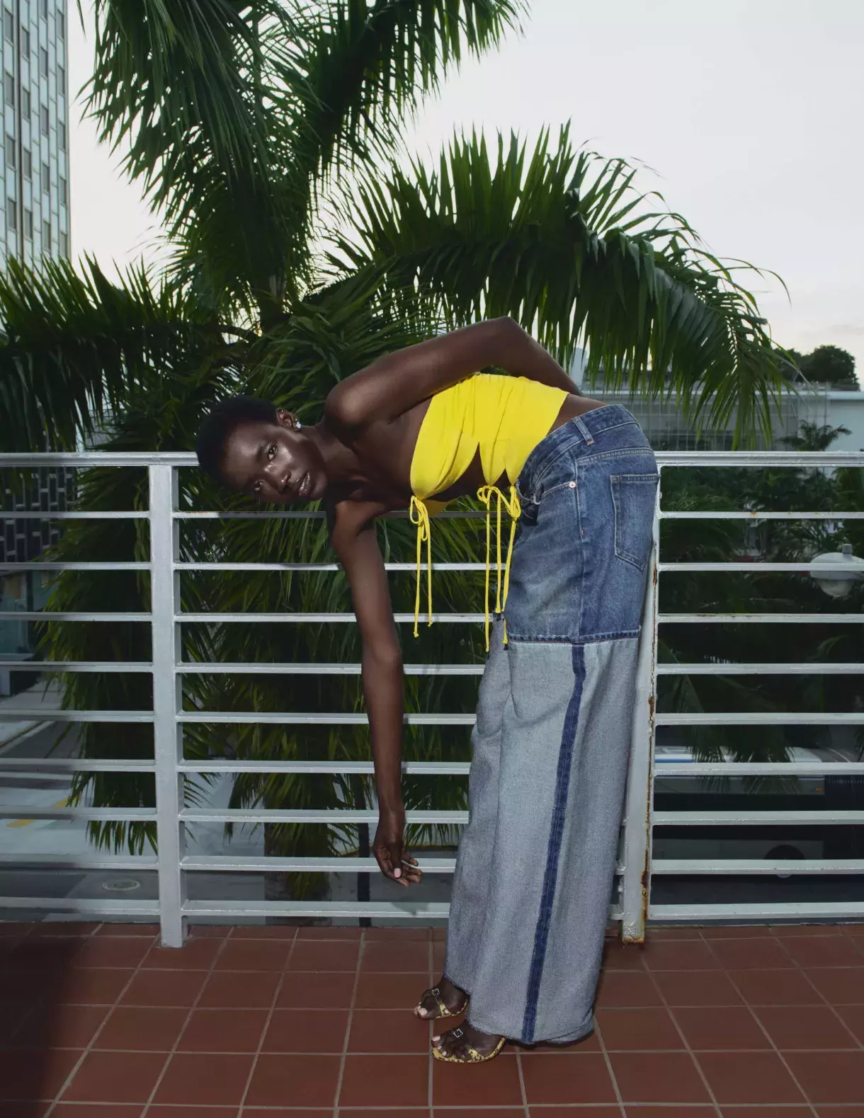 Top, Siedres; denimové kalhoty, Maison Margiela; boty, Manolo Blahnik