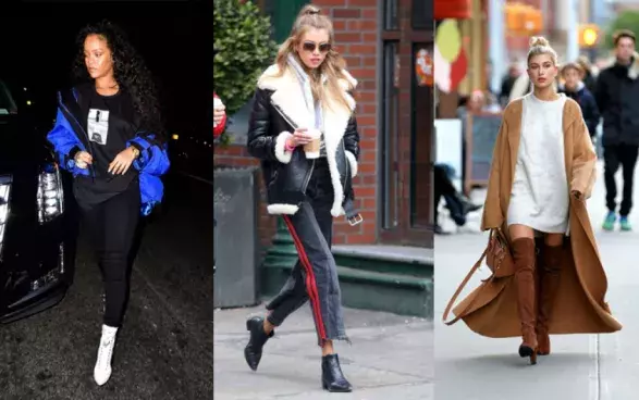 Lyžařská bunda, pánské triko a bílé kotníkové boty. Vše v jednom outfitu. Módní faux pas? Ne, pokud dané kousky zkombinujete jako Rihanna. Trendy bundu ledabyle shozenou z ramen, tričko zastrčené do úzkých džín a boty nějaké cool vázací.