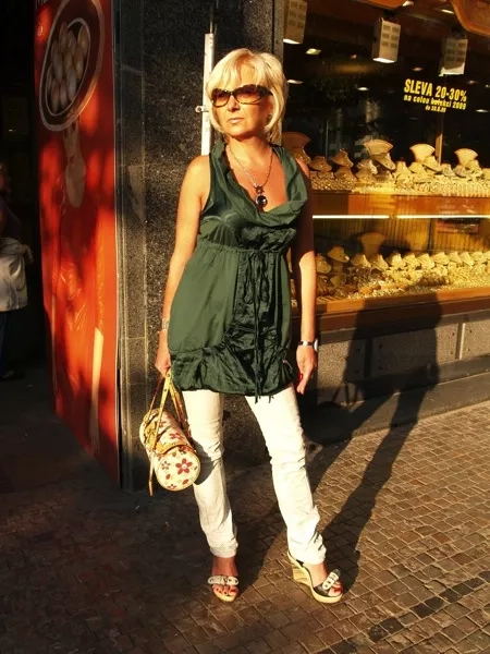 Svůj elegantní look postavila Jitka na výrazném topu a dobře udělala, bezesporu vyzdvihl přednosti její postavy. Nás zaujal i svým zajímavým střihem a jemnými detaily – stylovou klokaní kapsou a lemovaným dekoltem. Ocenily jsme i krásný odstín zelené, s nímž dobře ladí i šedozelený šperk. K volnějšímu a delšímu topu pak Jitka dobře zvolila úzké kalhoty, které zdůraznily její štíhlé nohy.
