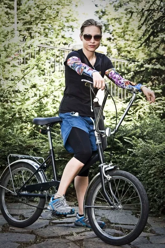 Taška – Adidas Stella McCartney, tričko – Adidas, legíny – American Apparel, šortky – American Apparel, potetované cyklistické rukávy – Sugoi (dostala jsem je od dlouholetého kamaráda Lukáše a jsem za ně vážně ráda, jsou praktické a zároveň zábavné), tenisky – běžecké outdoorové boty Adidas, hodinky – digitálky Casio, brýle – Chanel, kolo – klasika, SOBI 20