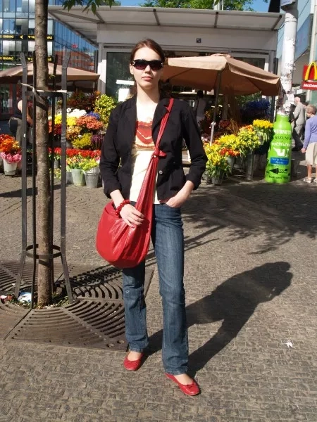 Když Petra procházela kolem květinářství, za kterým jsme s fotografkou číhali, okamžitě nás zaujala její červená kabelka. Co kabelka... Kabela! Krásná barva, dostatečně velká, takže se do ní hodně vejde, prostě skvělá volba. Navíc je kabela na jedno ucho opravdu trendy. Hlavně je to ale konečně taška, která nesklouzává z ramena. Vypadá ležérně a dodává Petře styl.