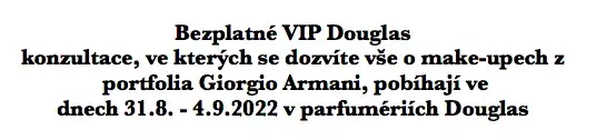 Bezplatné VIP konzultace, ve kterých se dozvíte vše o make-upech z portfolia Giorgio Armani, probíhají ve dnech 31.8. - 4.9. 2022 v parfumeriích Douglas. Přijďte, můžete se s make-up konzultanty nejen poradit, ale odnést si i slevu ve výši 20 % nebo dárek k nákupu. Seznam míst, kde VIP konzultace proběhnou, a objednací termíny, najdete zde. A pokud jste ze Slovenska, mrkněte sem.