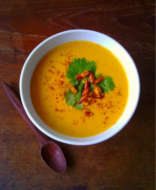 3. Na pánvi nasucho opražte dýňová semínka, petrželku nasekejte nadrobno, polévku rozdělte do talířů, ozdobte semínky a petrželkou.
