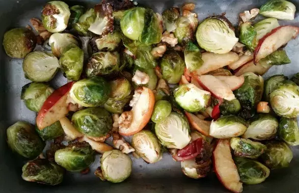 Předehřejte troubu na 180°C, režim horkovzduch. Očistěte kapustičky (odřízněte nevzhledný spodek spolu s horní vrstvou lístků) a rozpulte. Jablíčka nakrájejte na měsíčky. Dejte do pekáčku, zalijte olejem, promíchejte. Dejte do trouby na 20 minut. Když kapustičky hnědnou, přidejte nasekané ořechy a hrozinky. Nechte ještě 5 minut péct. Vyndejte, posypte cayenským pepřem a pokapejte javorovým sirupem. Promíchejte a můžete podávat.