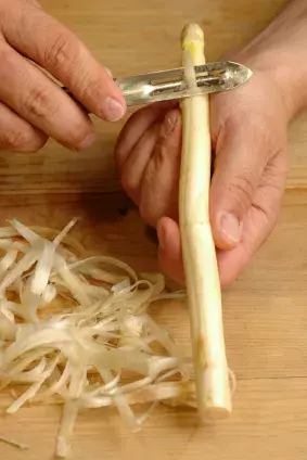 Bílý chřest stačí oloupat (škrabkou na brambory) směrem od hlavičky dolů (buďte nemilosrdní, tlustá vlákna, která nejdou překousnout, by vám zkazila celý zážitek).