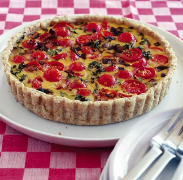3 Smíchejte sójové mléko, jogurt, vejce a lístky tymiánu. Dobře osolte. Na dno koláče navršte cibuli, slaninu a rajčata, přidejte mléčnou směs a ozdobte větvičkami tymiánu. Pečte 30 minut, dokud náplň neztuhne.