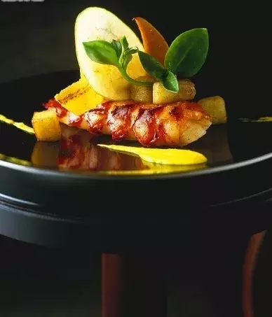 – Pečená vepřová panenka v pancettě, křenová omáčka, bylinková palačinka plněná kapustovým ragú, kroketa z konfitovaného vepřového bůčku