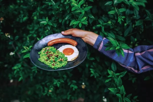 Hraškovou kaši promíchám s celým hráškem a dám ji na talíř. Kaši pak ozdobím opečenou cibulkou, přidám k ní párek a vejce a za pár minut budu v plné síle připravena na Vary!