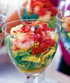 3. Těsně před podáváním najemno pokrájejte avokádo (obejdete se i bez něj, ale kombinace máslové konzistence avokáda a jemných krevet je vynikající). Lístky salátu nebo rokety natrhejte na menší kousky a rozdělte je do sklenek (v nichž budete koktejl podávat). Na salát navršte krevetky a přelijte zálivkou. Podávejte s bagetou nebo chlebovými plackami. Ty nejlépe chutnají, když je potřené trochou oleje rozpečete v troubě.