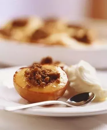 - Pečte při teplotě 190 °C asi 40 minut, dokud broskve nezměknou a náplň nevytvoří kůrčičku.