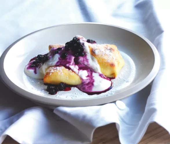 Bliny potřete zbylým máslem a zapékejte 20–30 minut, aby byly nadýchané a zlatavé. Zatím připravte borůvkovou omáčku: v kastrolu smíchejte borůvky s cukrem a citronovou šťávou a na středním plameni přiveďte k varu. Vařte tři minuty.
