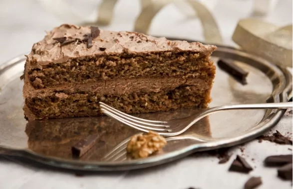 5. Upečený vychladlý korpus rozřízněte na dvě vrstvy. Na servírovací dortový talíř si položte první vrstvu a polijte ji rovnoměrně polovičním podílem směsi kávy a rumu. Natřete polovinou krému a položte druhou vrstvu korpusu, kterou opět polijte zbývající kávou s rumem. Teď už jen celý dort schovat pod vrstvu mírně sladkého, jemného čokoládového krému a dozdobit. 6. Klasické zdobení je obalit celý dort nebo jen boky v strouhaných ořeších, ale to ve mně vyvolává vzpomínky, které mám na ty kupované, po margarínu chutnající dorty, tak jsem ho nechala jen tak a doladila alternativně. Krásné jsou třeba jedlé zlaté plátky, které dodají slavnostní atmosféru, nebo trocha čokolády a vlašských ořechů.