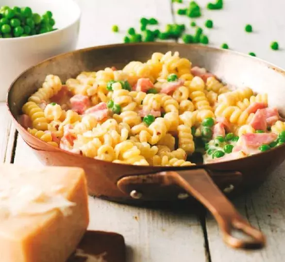 Na 2 lžících másla opékejte 3 minuty malou cibuli, nakrájenou nadrobno, a 100 g šunky na kostičky. Poprašte lžičkou hladké mouky, rozmíchejte a zalijte 250 ml 30% smetany. Přiveďte k varu a po 2 minutách přidejte 200 g mraženého hrášku, sůl, pepř a vařte další 3 minuty. Vmíchejte fusilli; podávejte s parmazánem.