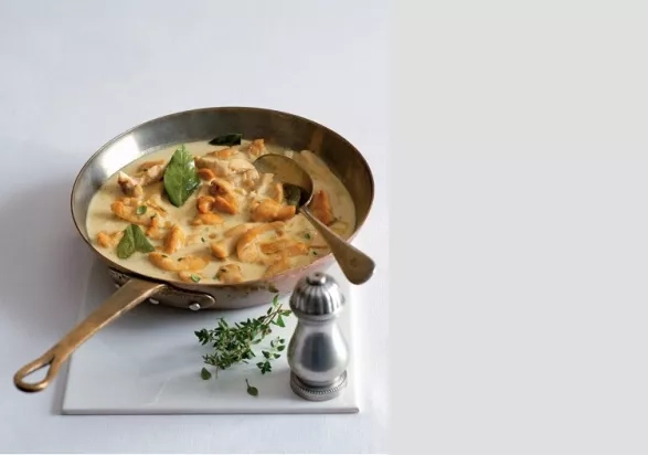 3. V kastrolu rozpusťte zbývající máslo, zaprašte moukou a míchejte a opékejte asi pět minut dorůžova. Přilijte vývar, důkladně zamíchejte a přiveďte k varu. Pak přidejte maso se šťávou z mísy, přiklopte a zvolna vařte pět minut. Přilijte smetanu, případně dosolte a po vychladnutí zamrazte.