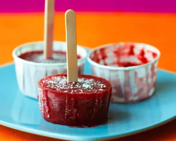 Cukr smíchejte v rendlíku s 125 ml vody a na nejnižším plameni zahřívejte, dokud se nerozpustí. Pak zvyšte plamen a minutu vařte. Dejte stranou vychladit. Mezitím vložte maliny do robotu a rozmixujte je na hladkou směs. Pak propasírujte přes jemné sítko a spojte s vychladlou cukrovou vodou a citronovou šťávou. Přendejte do čtyř menších kelímků, dovnitř zapíchněte dřívko a dejte na čtyři hodiny do mrazáku.