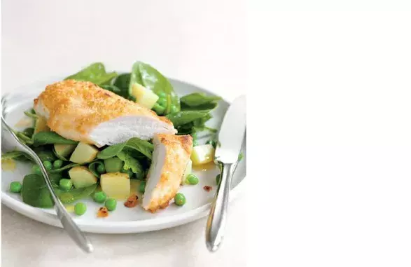 Mezitím vařte brambory 10 minut, na poslední 3 minuty přihoďte hrášek, pak sceďte. Smíchejte se špenátem, octem, olejem, osolte a opepřete. Rozdělte na talíře, jezte s kuřetem.