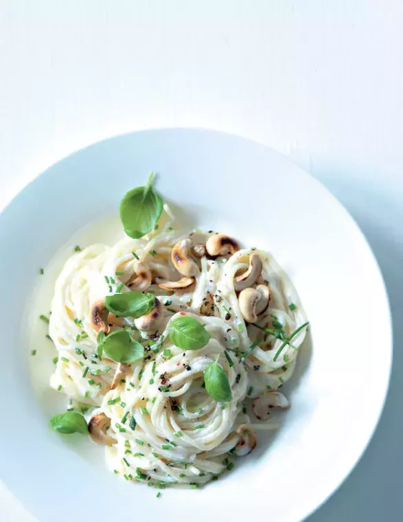 2 . Mezitím v menším kastrůlku vařte 2 minuty na mírném ohni smetanu, přidejte ricottu a rozmíchejte dohladka. Smetanovou směs osolte, opepřete a promíchejte se špagetami a většinou pažitky.