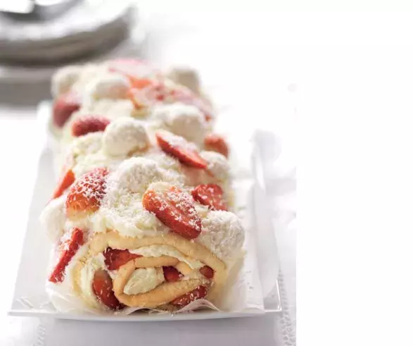 Stočený plát těsta rozviňte, potřete náplní a znovu stočte. Zbylý krém rozetřete na roládu, poklaďte plátky jahod, kuličkami rafaela a ještě lehce posypte kokosem.