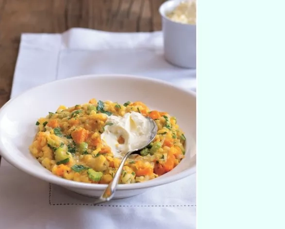2 Zbývající olej zahřejte v těžkém hrnci na nízkém plameni. Vsypte cibuli a 2–3 minuty ji opékejte doměkka. Přidejte celerové řapíky a ještě minutu opékejte, pak přidejte zázvor a rýži a další minutu míchejte, aby se všechna zrnka rýže obalila. Zvyšte plamen na střední, vlijte víno a vařte, dokud se neodpaří. Pak po naběračkách přilévejte vývar, vždy počkejte, až se vstřebá. Pokračujte 15 minut, nebo dokud rýže nebude uvařená, ale přitom ještě pevná na skus. Přidejte citronovou šťávu, dýni a petrželku. Osolte a opepřete, vmíchejte mascarpone.