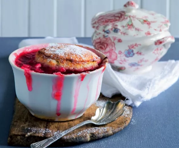 Rebarboru (i se šťávou a vodou) rozdělte do šesti zapékacích misek (každá o objemu zhruba 380 ml). Navrch opatrně posaďte knedlík a pečte 20–25 minut, nebo dokud těsto ulpívá na špejli. Podávejte posypané moučkovým cukrem.
