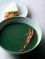 Řeřichu nakrájejte najemno. Brambor oloupejte a nastrouhejte. Do většího hrnce dejte vařit vývar. Vložte do něj brambor a zvolna vařte 20 minut. Přidejte řeřichu a nechte ještě projít varem. Slaninu dozlatova osmažte po obou stranách (nejlépe v teflonové pánvi). Polévku rozmixujte se smetanou, osolte, opepřete a pak už rozdělte do nahřátých talířů. Nejlépe chutná s uzenou slaninou! Jako přílohu můžete připravit sendviče: lehce opečte čtyři krajíčky chleba bez kůrky a namažte je krémovým sýrem. Obložte nakrájeným uvařeným vajíčkem, několika lístky nasekané řeřichy a jemným špekem, nasucho osmaženým na pánvi. Udělejte sendviče a rozkrojte je po úhlopříčce.