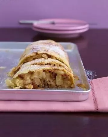 2) Potřete mlékem a pečte 25–30 minut nebo dokud těsto není zlatavě hnědé a ovoce měkké. Nakonec smíchejte moučkový cukr se skořicí a štrúdl jím posypte. Posypte zbývajícími lískovými oříšky a podávejte horké nebo teplé s jogurtem nebo fromage frais.