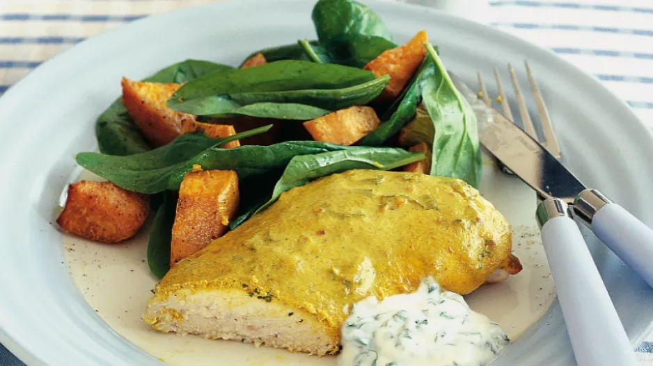 Recepty Redakce / Sdílet Pálivé kuře se sladkými bramborami a špenátovým salátem Milujete pečené kuře? A co ho tentokrát zkusit po indicku?