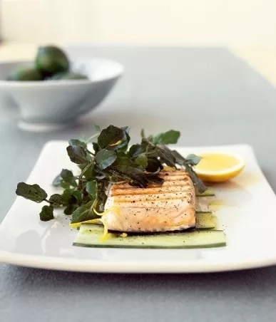 - Losos na grilu podávaný s topinamburovým pyré a paprikovou kaponátou