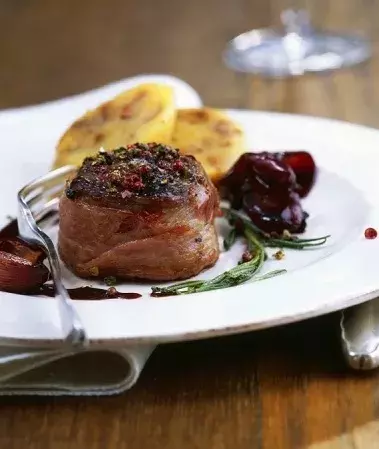 - Pečené jehněčí kotletky ovoněné čerstvým rozmarýnem, grilovaná zelenina, restovaný špenát a kukuřičná polenta