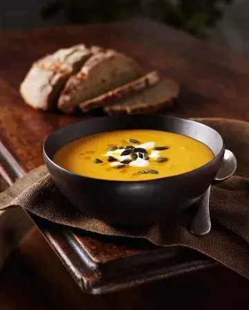 - Krémová polévka z pečené dýně parfémovaná šafránem, zdobená cuketovými hranolky a kapkou dýňového oleje